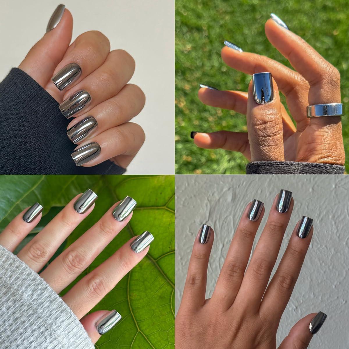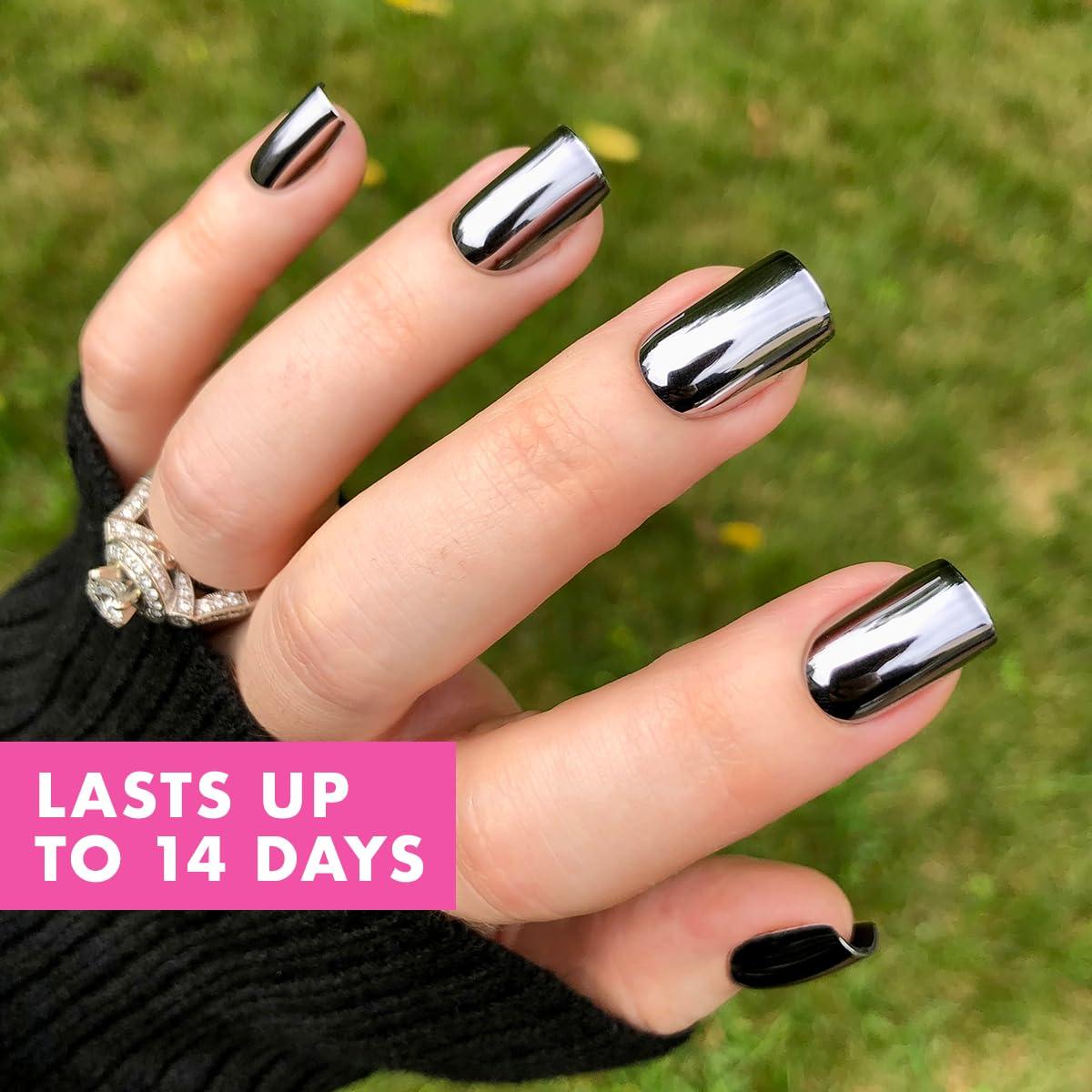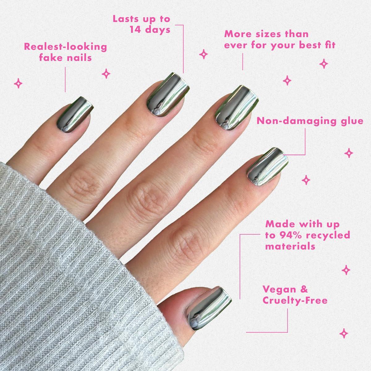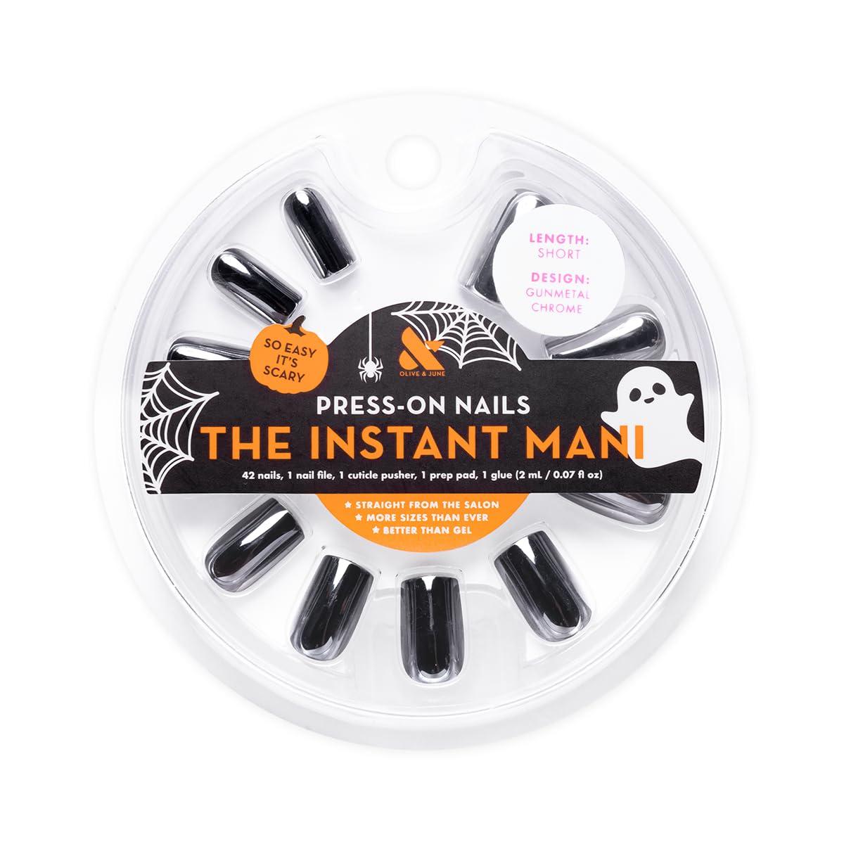 Olive & June Instant Mani Press-On Nails | Glue | Short Square | 42 Pieces, 21 Sizes | Non-Toxic, Long-Lasting Recycled Materials Realistic Look | Salon-Quality at Home | Halloween Gunmetal Chrome