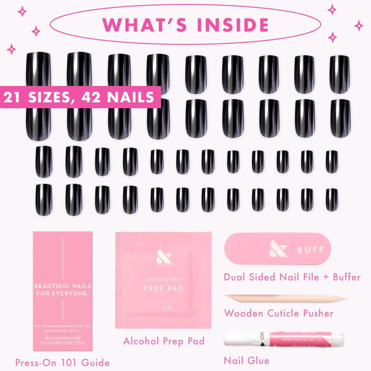 Meet the realest-looking fake nails you’ve ever seen. The Olive & June Instant Mani is the secret to a salon-quality press-on manicure at home—no appointments, no damage, no compromise. With 42 press-on nails in 21 inclusive sizes, these press-ons are designed with engineers and tested on thousands to ensure your best fit ever. Get up to 14 days of wear. Fake nails never looked so real. Each Instant Mani features custom-shaped nails that mimic the natural curve of your nail for the realest-look. Apply with our non-toxic, non-damaging glue for long-term wear that lasts up to 14 days. Our press-ons are made from 94% post-consumer recycled materials, so they not only look good, they do good. In custom nail shapes and lengths and in all your favorite colors and designs. When you need a mani in an instant, Olive & June delivers. From LA’s hottest salon, straight to your doorstep. Since 2013, Olive & June has been bringing their mission of beautiful nails for everyone to life with their innovative all-in-one systems designed to make salon-quality nails accessible. From polish, to press-ons, to gel— it’s never been easier or more fun to live your best nail life.